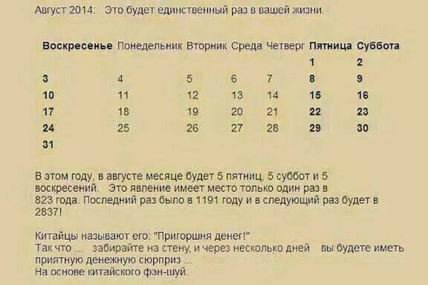 Такое бывает всегда, если месяц, имеющий 31 день, начинается с пятницы. Следующий такой - май 2015 года, затем январь 2016. Или я не понял, в чём уникальность именно нынешнего августа???...