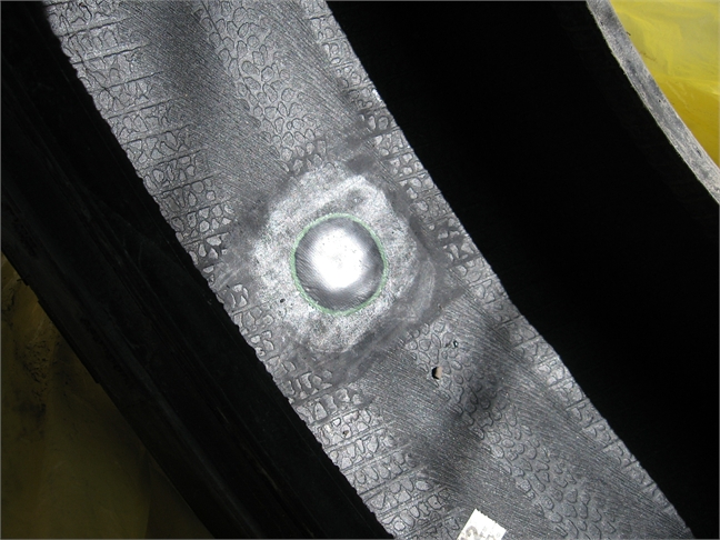 Резина абсолютно ровная, единственный прокол от шурупа заклеен капитально, не жгутом, видно на фото.