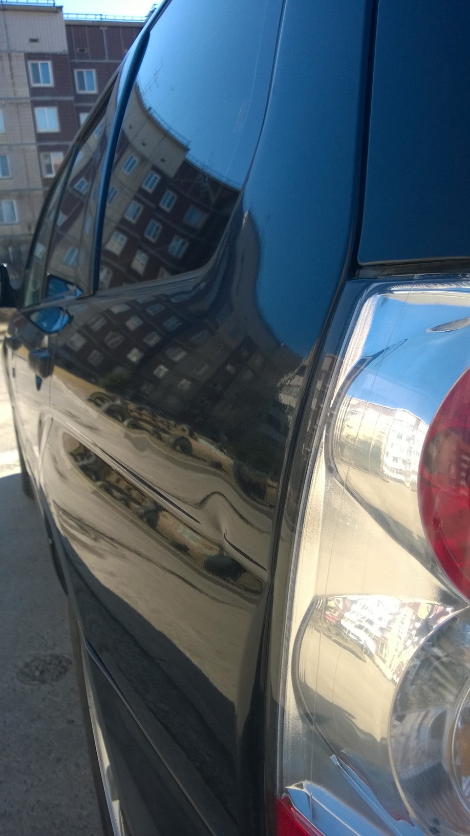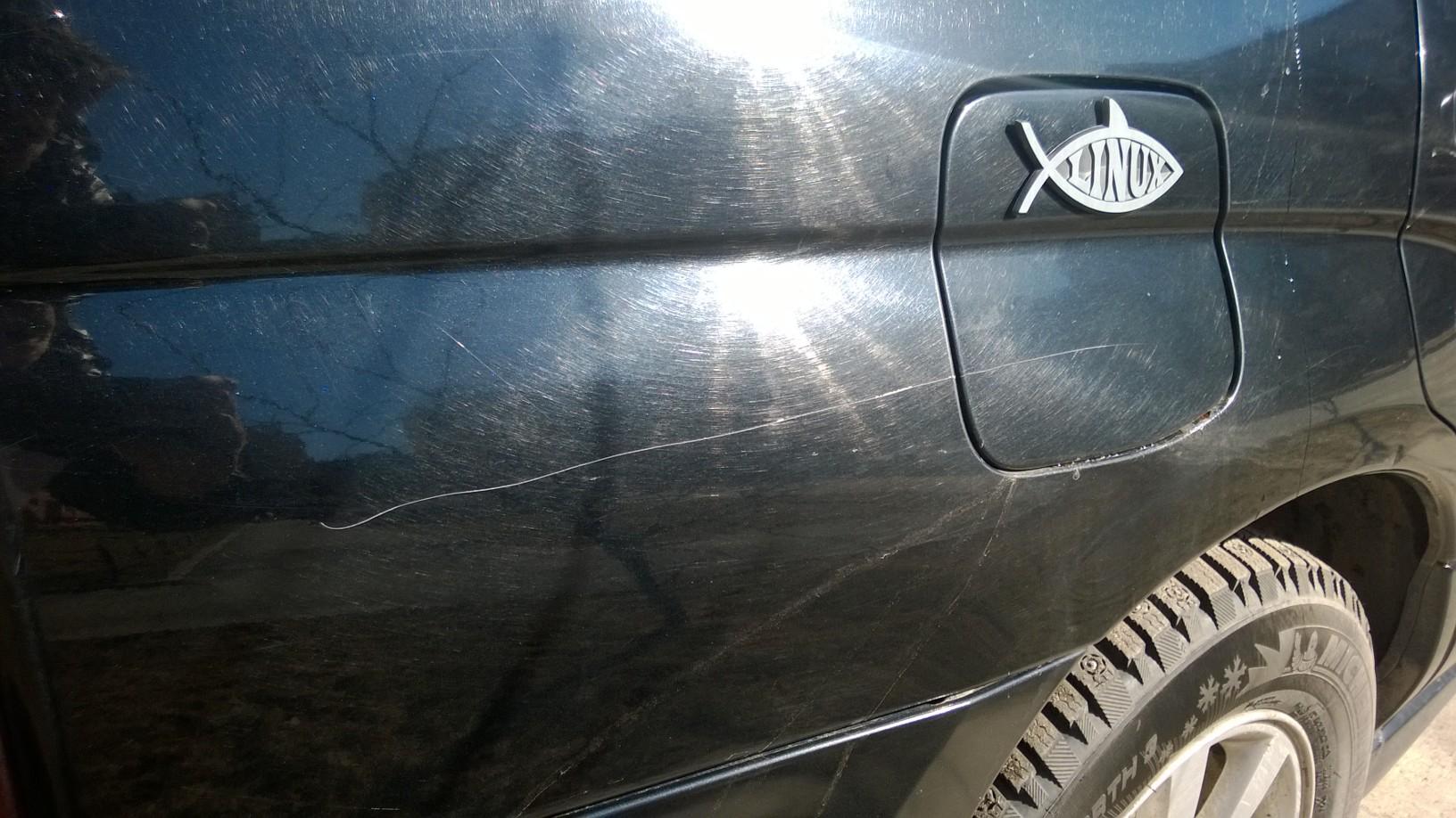 Бывал в мелких ДТП: кто-то неумело парковался и прокорёжил левые двери. Заднюю наверное имеет смысл покрасить, переднюю я бы не стал. Сегодня помыл авто и обнаружил на заднем крыле (от фары и до лючка бензобака) след от гвоздя
