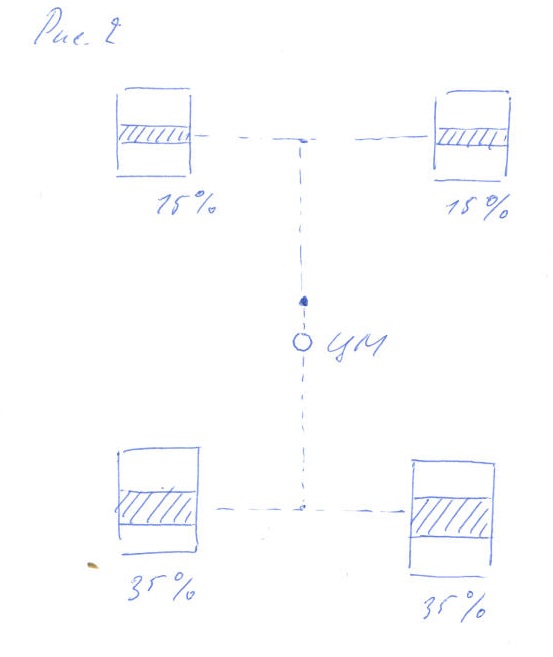 Объяснение удобно начинать традиционно, - изобразив схематическую машинку-тележку в статике. С "идеальной" (это лишь условность) развесовкой по осям - 50% на 50%. Напомню, что движитель, - шины, и автомобиль разгоняется, тормозит и поворачивает исключительно благодаря им. Стоящая в полном покое на дорожном полотне, наша тележка имеет сцепление с поверхностью. Для доступности последующего изложения нужно сделать упрощение и заявить: пускай совокупность всех геометрических свойств пятен контакта 4-ых шин и совокупности сил, к ним приложенных, характеризуется как 100% сцепление тележки с поверхностью дорожного полотна. Силы, как легко заметить, в данном конкретном состоянии определяются расположением центра масс (ЦМ) тележки относительно точек соприкосновения шин на плоскости опоры - т.е. дорожного полотна. (В нашем случае все аккуратненько "по центру".) И эти силы определяют такую, в общем-то, очевидную характеристику, как статический баланс. Заметьте: пока не существенна высота ЦМ относительно дороги. В случае нашей тележки - смотрим на рисунок (1-ый) - видно, что на каждое колесо в покое (или в случае равномерного прямолинейного движения* ) приходится по 25% от общего коэффициента сцепления покоя (в том упрощенном смысле, в котором он определен).