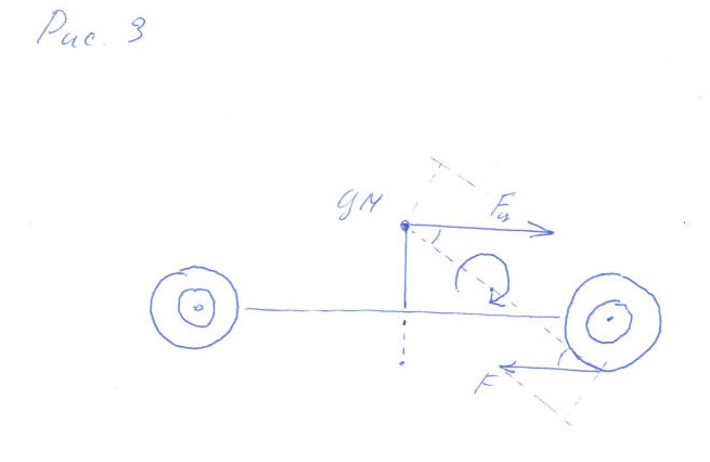 Теперь мысленно приделываем к нашей тележке двигатель и трансмиссию, превращая её в авто. Думаю, что все не раз убеждались на практике, что при разгоне вес перераспределяется на заднюю ось. См рис. 2. А почему так происходит? - Автомобиль, как физическое тело стремится оставаться в покое, а силу инерции справедливо приложить к центру масс. При этом силы, двигающие автомобиль вперед, приложены к ведущим колесам (пускай наши ведущие - сзади, это не принципиально) на уровне дорожного полотна. А плечо, равное высоте ЦМ над полотном дороги, виновато в создании вращающего момента, из-за которого ЦМ авто и смещается в сторону задней оси. А куда ж ему деваться-то. Смотрим рис. 3.