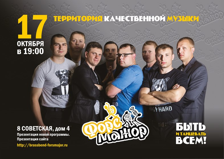17 октября, в субботу в 19-00 по адресу 8-я Советская улица д4 состоится презентация новой программы нашего замечательного коллектива: Брасс-бэнд "Форс-Мажор"