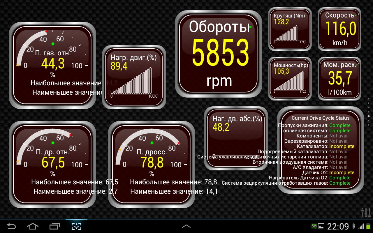 DeNskyline писал(а):Можно замерить крутящий, л.с, показывает буст, темп охлаждайки, маф , температуру впускаи кучу всего, не разобрался пока как вывести EGC и давку масла, видимо по этому протоколу не снять данные... Также можно считывать и скидывать ошибки, есть индикатор перегрузок (G sensor)