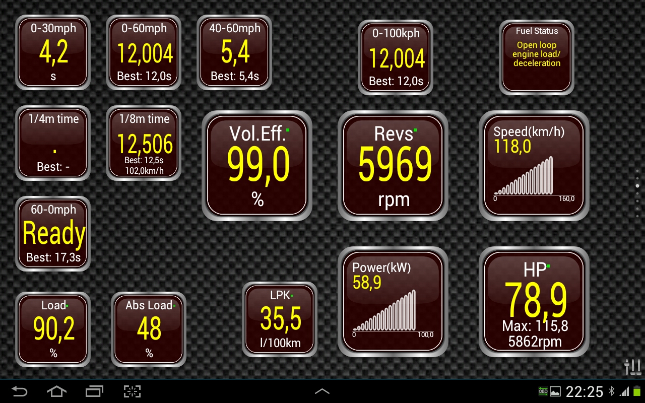 Есть еще оффигеная прога для ELM Harry's GPS LapTimer , в идеале еще иметь 5Мгц GPS модуль и прога на треке будет вести телеметрию, строить траектории , торможения , ускорения, а через ELM показывать, скорость , обороты в апексах , входах, выходах из поворотов , все это снимает встроенной камерой и накладывает на видео графику )