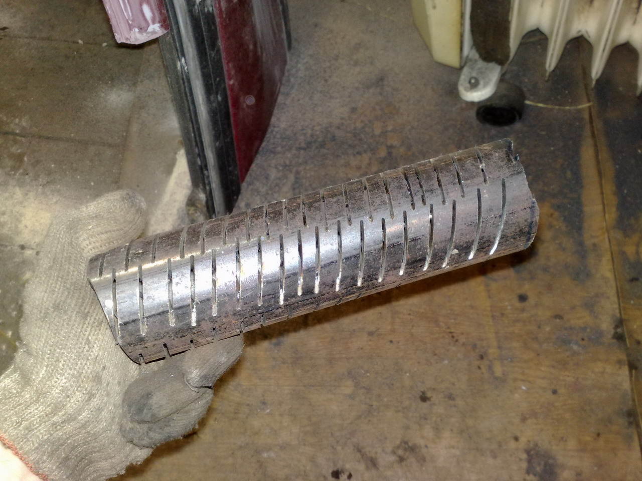 Сначала вырезал "окошко" в корпусе ката, примерил туда трубу водопроводную, а потом по всей поверхности трубы сделал много надрезов болгаркой (тк сверлить было очень лениво), затем выразал из того же обрезка трубы типо перегородки, и начал всё это вваривать на место. Потом всю эту конструкцию очень плотно обложил металлической стружкой со всех сторон и заварил всё обратно.