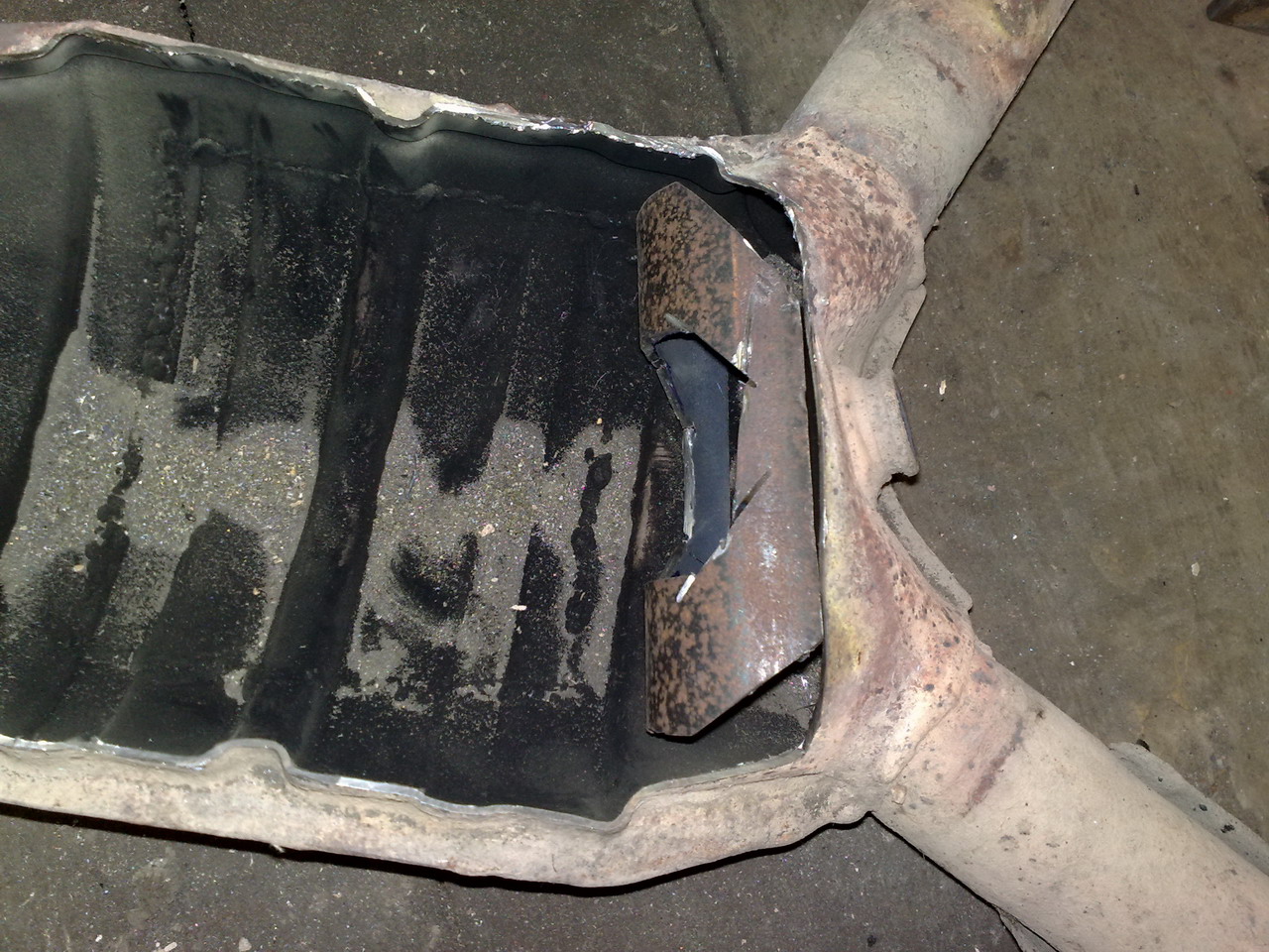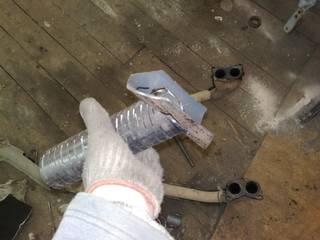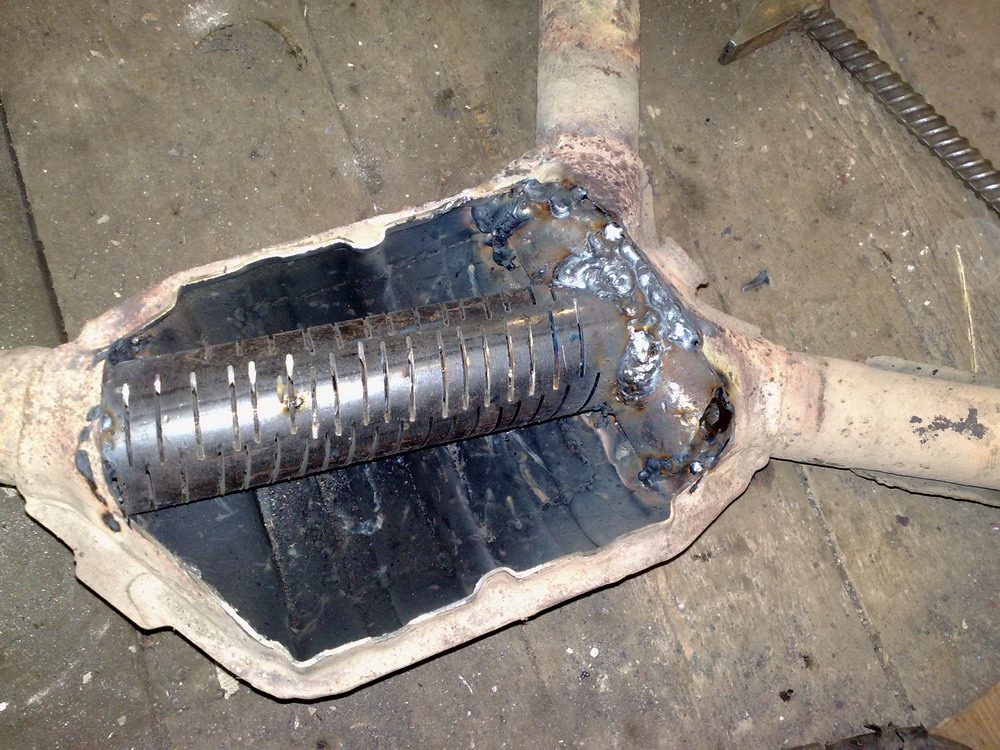 Что бы не резать сами трубы и вставлять пламегаситель в систему, решил использовать пустое пространство от сот катализатора.