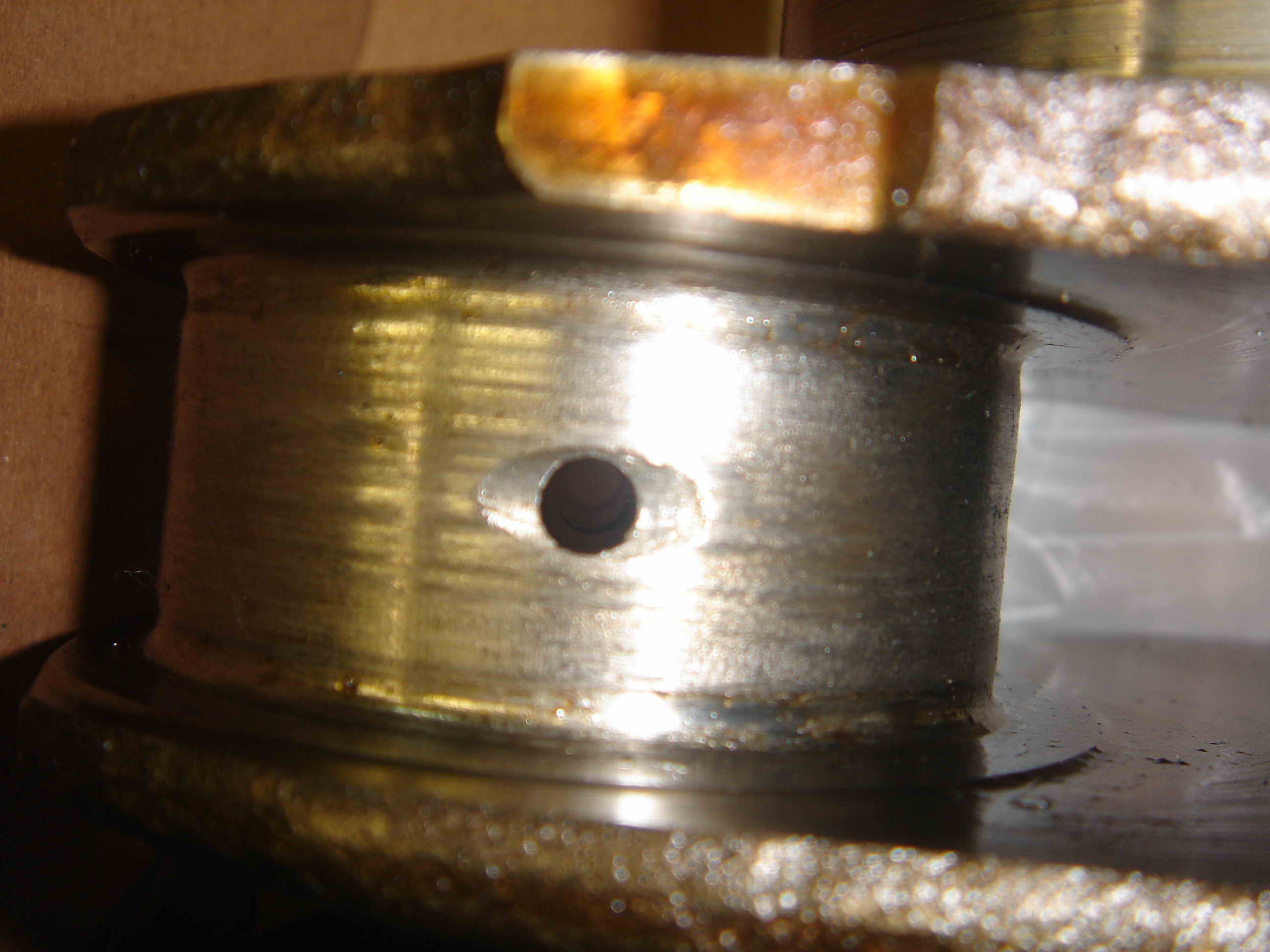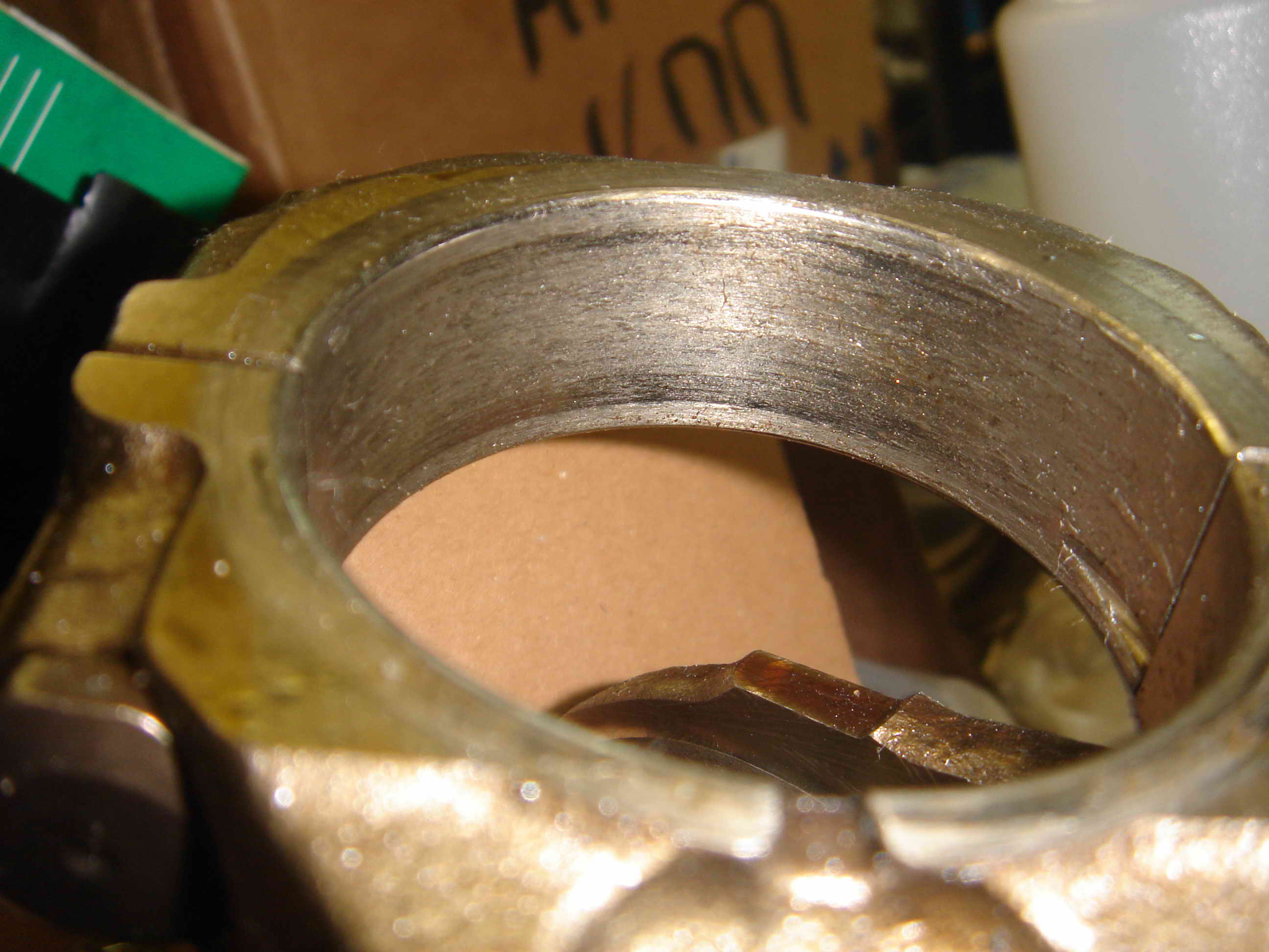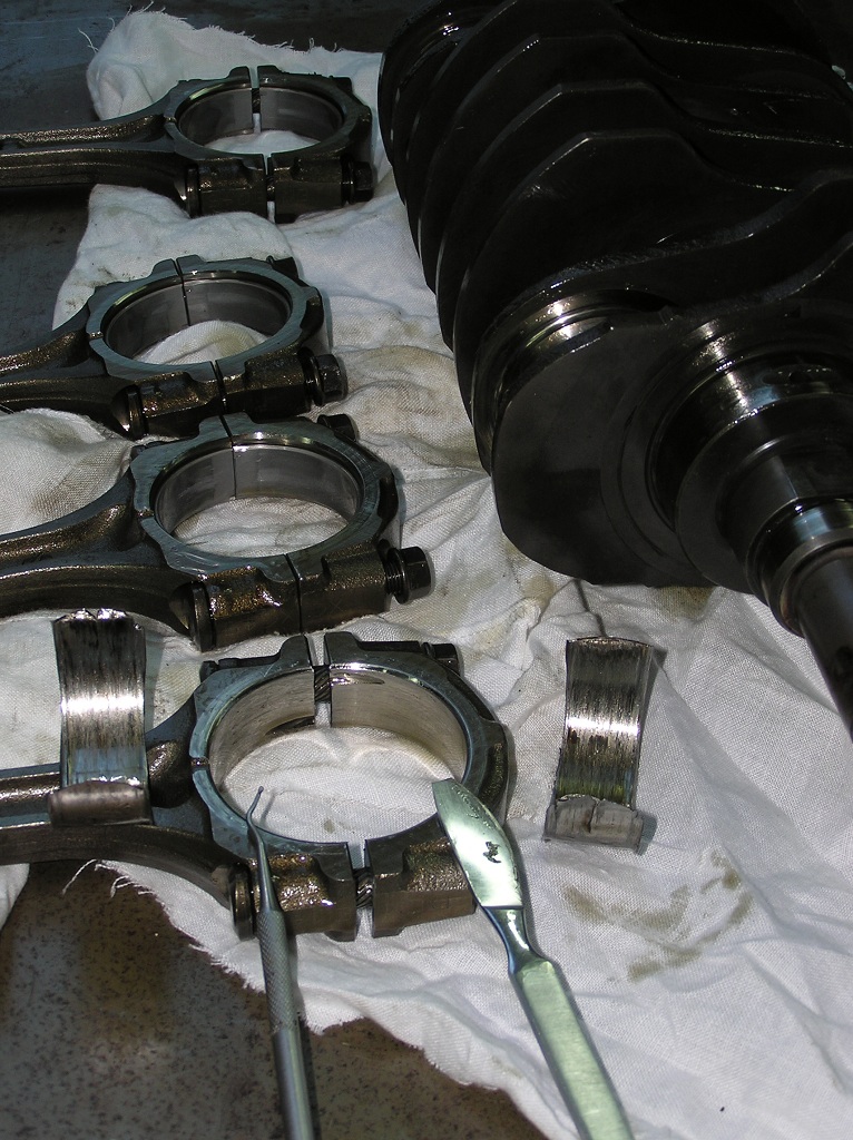 В очередной раз посмотрел фотки, у меня на 1-ом шатуне вкладыша не было вообще, показывать нечего, шейка колена сточилась больше последнего ремразмера и полный поддон стружки.)))