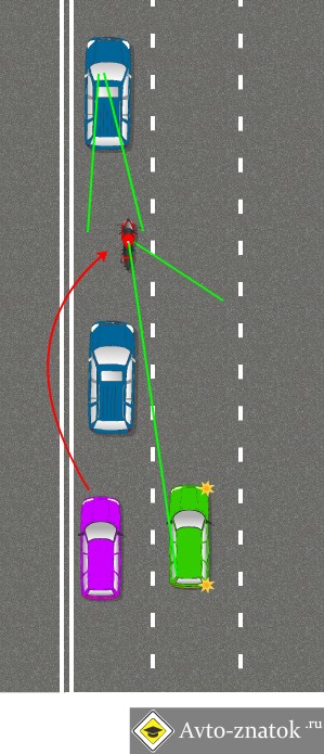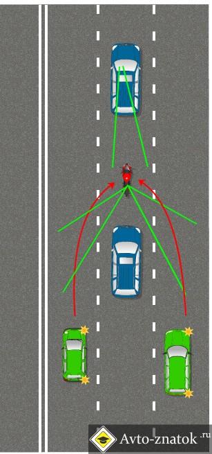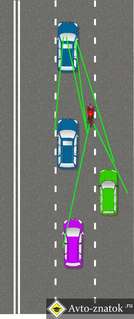 [size=13px][font=helvetica]Теперь мотоциклиста хотя бы один ряд видит. В нашем случае это ряд который справа. Он продолжает быть уязвим слева, причем зона, из которой его видно еще больше сократилась. В любом случае это передвижение более безопасно, оно позволяет мониторить преимущественно левую зону. И все равно это достаточно опасно.[/font][/size]