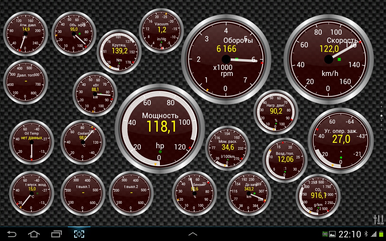 В Torque тоже эти функции есть, и тоже не все работают (на скриншоте видно, что не показывает температуру масла и выхлопа). А еще устройство с программой, как я понял, надо калибровать.